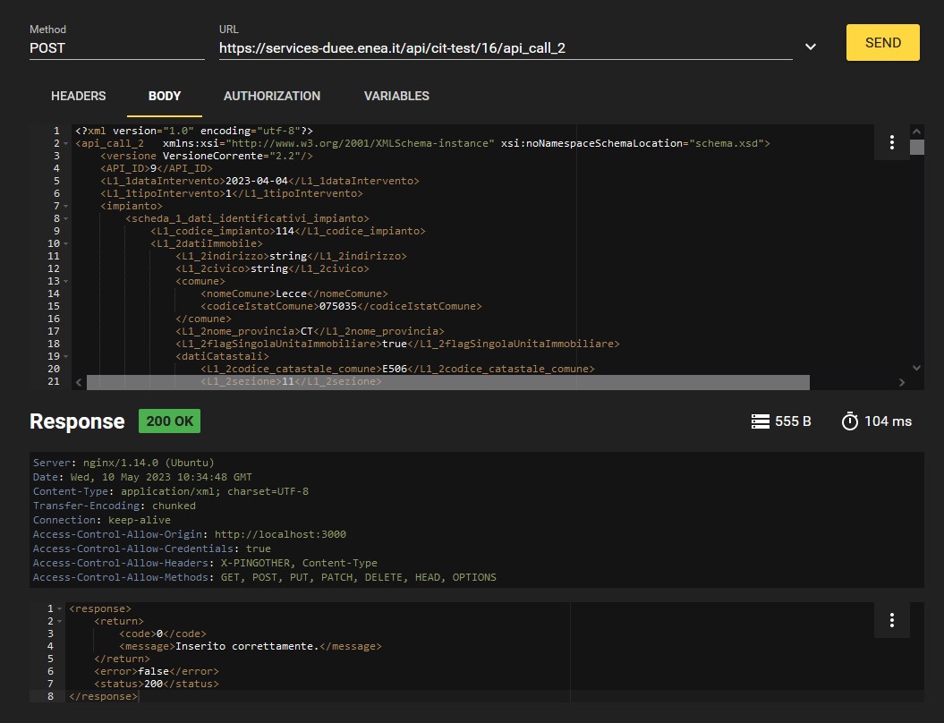 L'XML da inviare al catasto regionale dovrà essere inserito in formato testo nel body della richiesta di tipo POST, ed il content type deve essere di tipo “text/xml” o “application/xml” (RFC 2376). Di seguito un esempio di invio con in evidenza la parte di incapsulamento dell'XML nel body della richiesta.